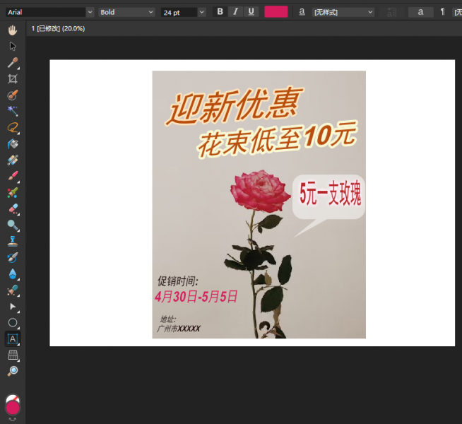 8、如果还有其他需要宣传的促销信息,可以一并加入。为了让促销信息更明显,可以借助Affinity Photo的标注类型工具。比如这里我们使用了“标注圆角矩形工具”,然后将“5元一支玫瑰”的促销信息写在上面,这样就很容易被顾客看到。