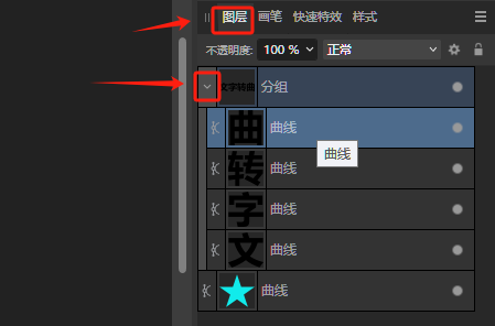 ⑤在转曲文字上点击鼠标右键后,选择“图层特效”,可以为曲线分组整体添加特效。