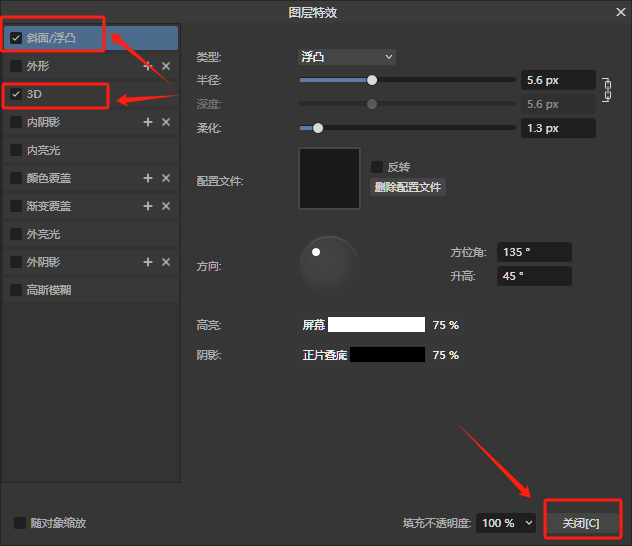 ⑥在图层特效中选择“斜面/浮凸”和“3D”,完成进行细节调整后,点击“关闭”按钮。